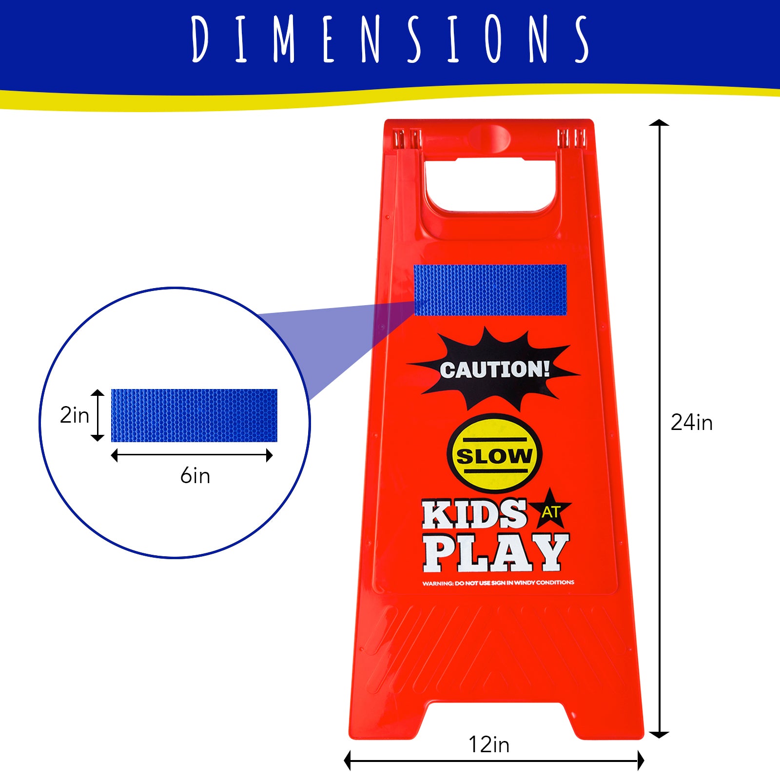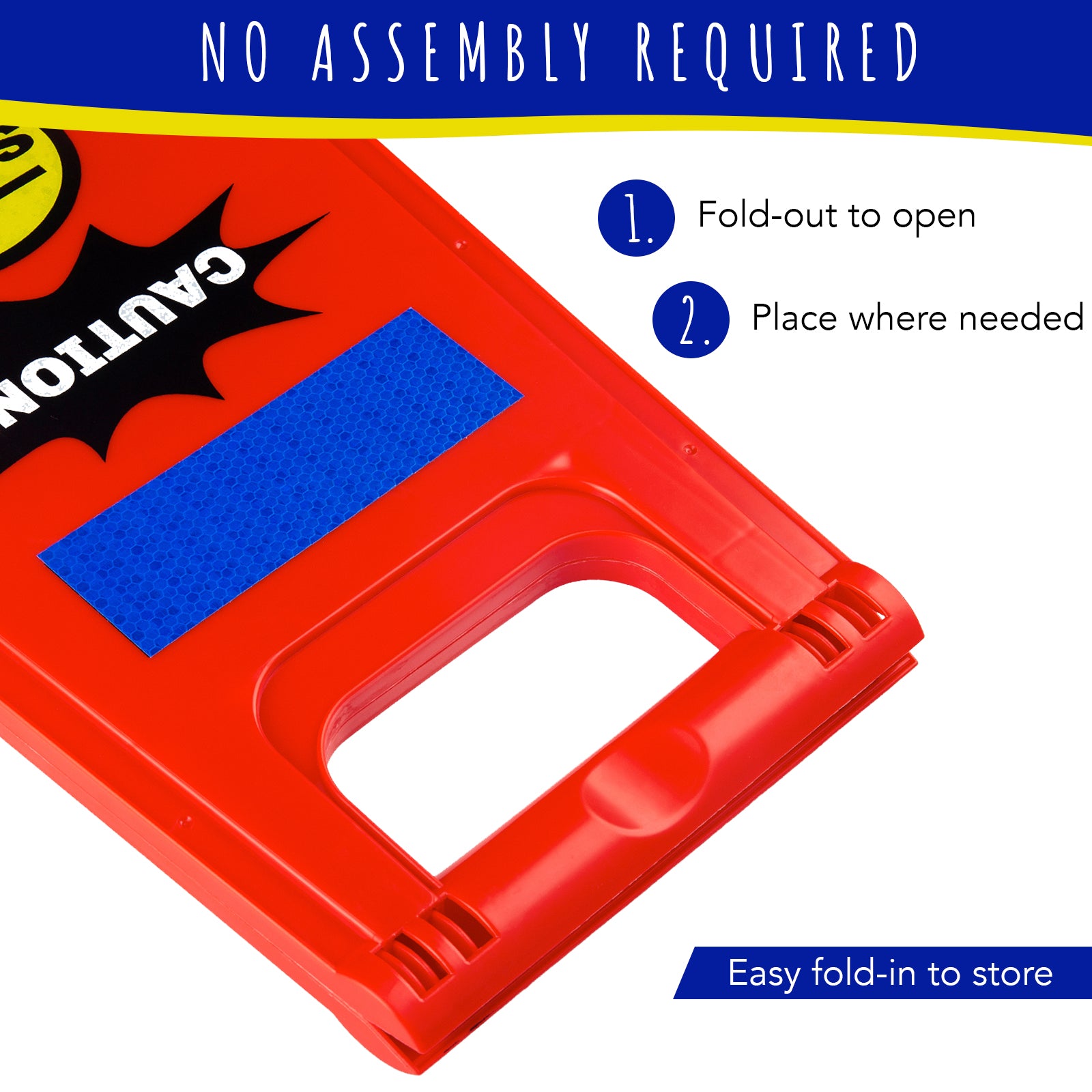 Our signs come ready to set up with no assembly required. The fold in and out for easy placement and storage. Further, they are double-sided and include a brilliant blue reflective bar on both sides as an added precaution to be seen by drivers coming from either direction.