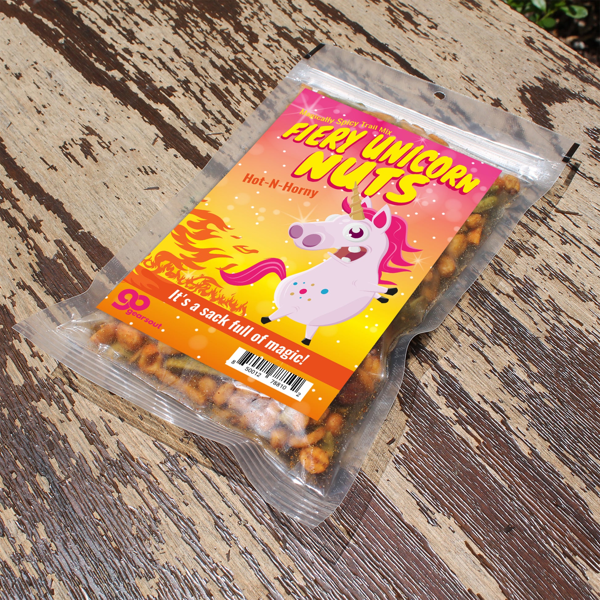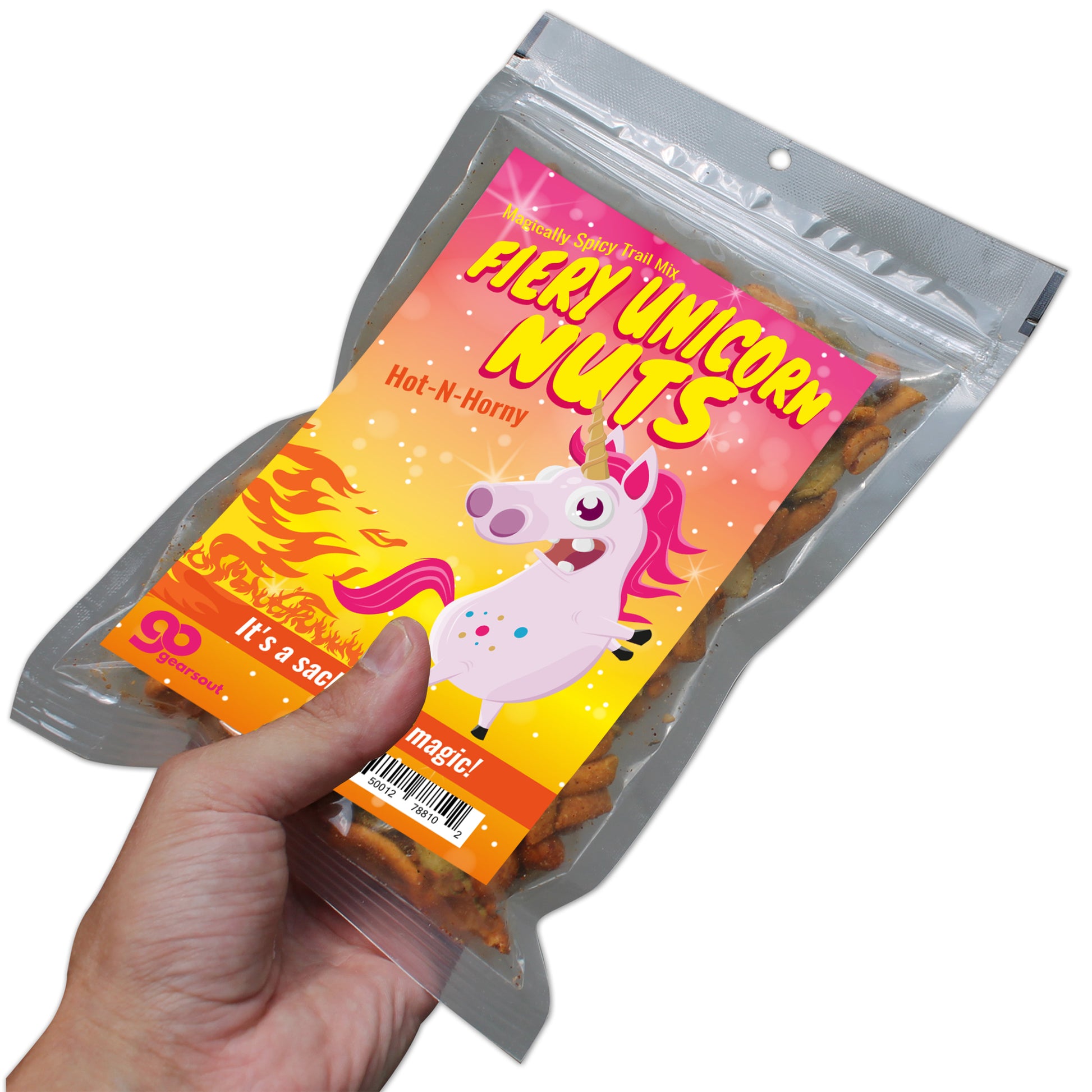 Unicorn Nuts Spicy Trail Mix is a silly gag gift for men and women who love hot snacks and bizarre surprises. It’s a crazy addition to Easter baskets, holiday care packages, and gift baskets. Slip this tasty, crunchy treat in as a funny stocking stuffer, or wrap it up as a cute, and slightly naughty white elephant idea.
