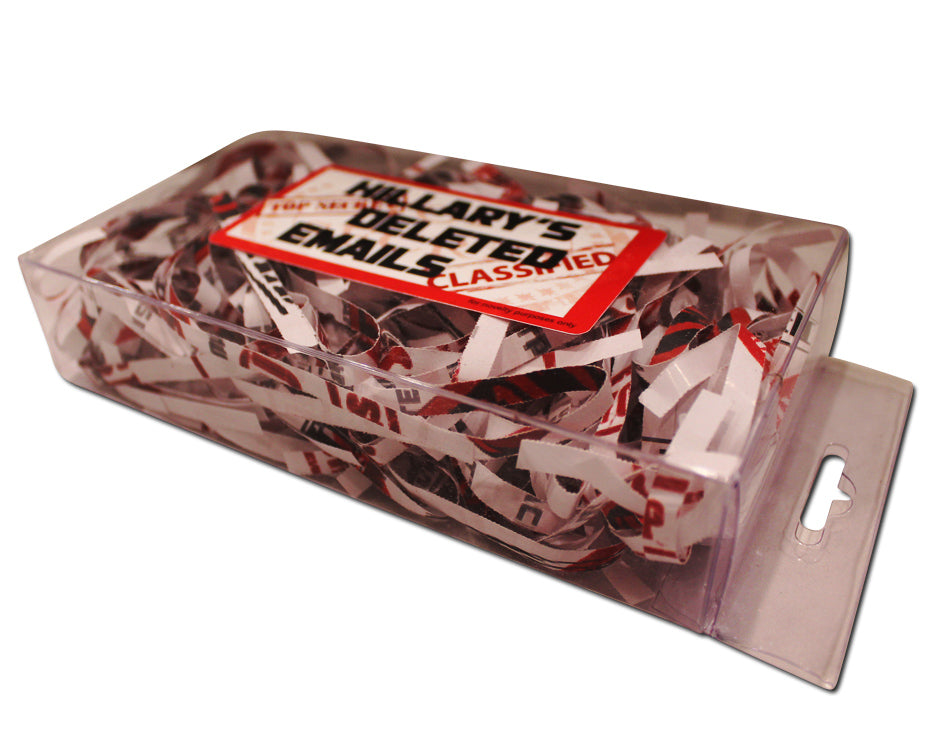 The clear gift box is marked with a classified label which reads “Hillary’s Deleted Emails” and contains shredded fake documents that have absolutely zero top secret information on them, because nobody can really find Hillary’s emails, and you know they’ve tried.