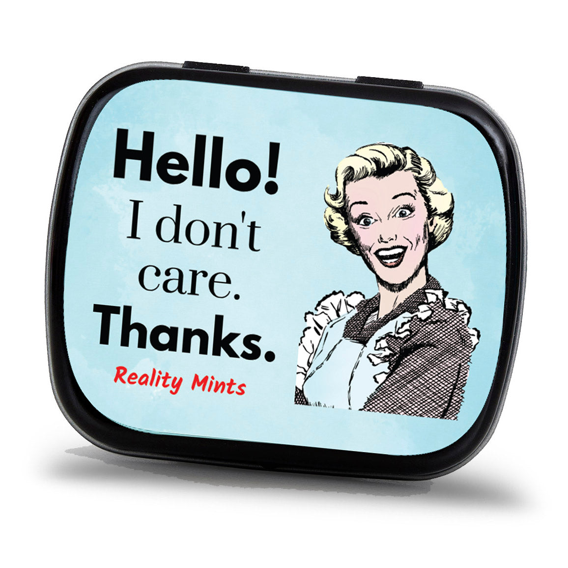 - Collectible mint tin reads: Hello! I don’t care. Thanks.