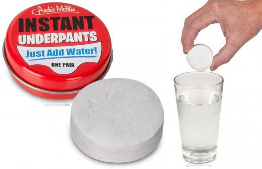 How many times have you gone out only to accidentally get your pants and underpants wet? Did you a cough get the best of you? Or maybe that Mexican food for lunch wasn't the best idea? Whatever the reason you needed Instant Underpants. These underpants-in-a-can are compressed into a tight pellet that loosens when wet. You'll never be caught without emergency undergarments again as long as you have Instant Underpants stashed in your glove compartment or purse. The disposable underwear are unisex and fit most children and small adults. Instant Underpants...for when crap happens.