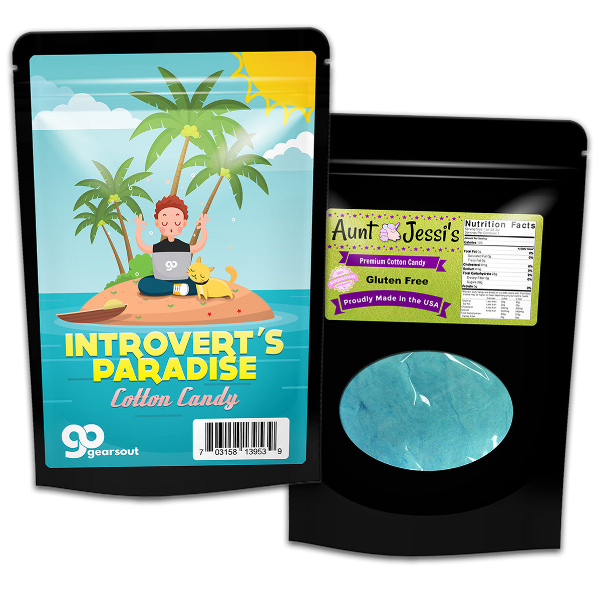 Introvert’s Paradise Cotton Candy is a sweet giggle for those who prefer some solitude now and then. Give them the gift of their own little island paradise, complete with laptop, kitty companion, and a small ocean of fluffy, blue cotton candy. Our sugary, gluten-free Introvert Cotton Candy is light-hearted chuckle for those who prefer a night in to a roaring crowd.