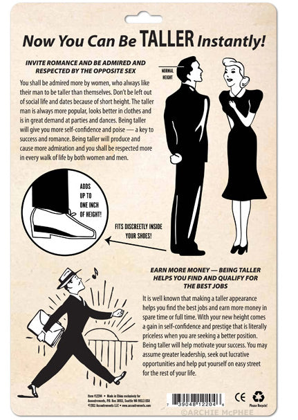Made to resemble similar products sold in the 1950's, the Look Taller Shoe Lifts are the perfect gift for anyone a little self-conscious about his height. These lifts will finally let them be the bigger man.