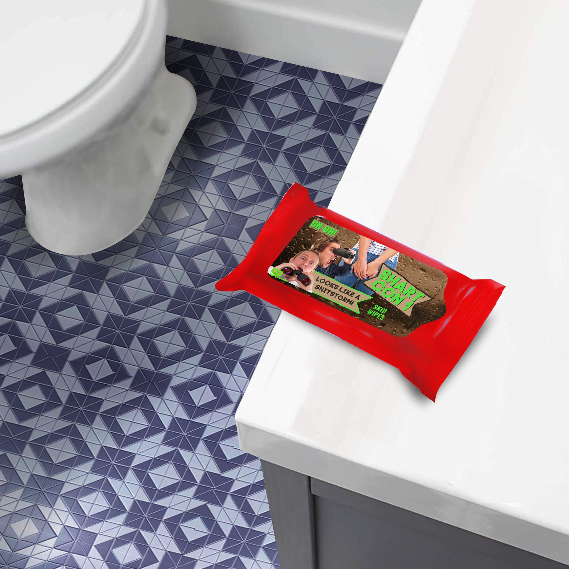 - Hilarious package says: Uh-Oh – Looks like a shitstorm! – Shart Con 1 Skid Wipes