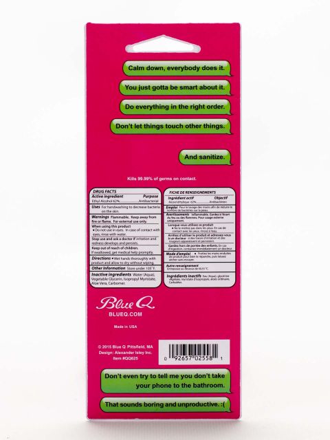 You may wonder why this little gem is important when you will just – hopefully – be washing your hands after you’re done anyway. Texting on the Toilet Hand Sanitizer is not only helpful after you do your business, but before! Think of all the germy surfaces you touch in a public restroom before you actually pull out your phone. Now, consider the fact that you’re going to be tappy tap tapping all those nasties all over your cell, which you’ll be holding right up to your face later. Yeah.