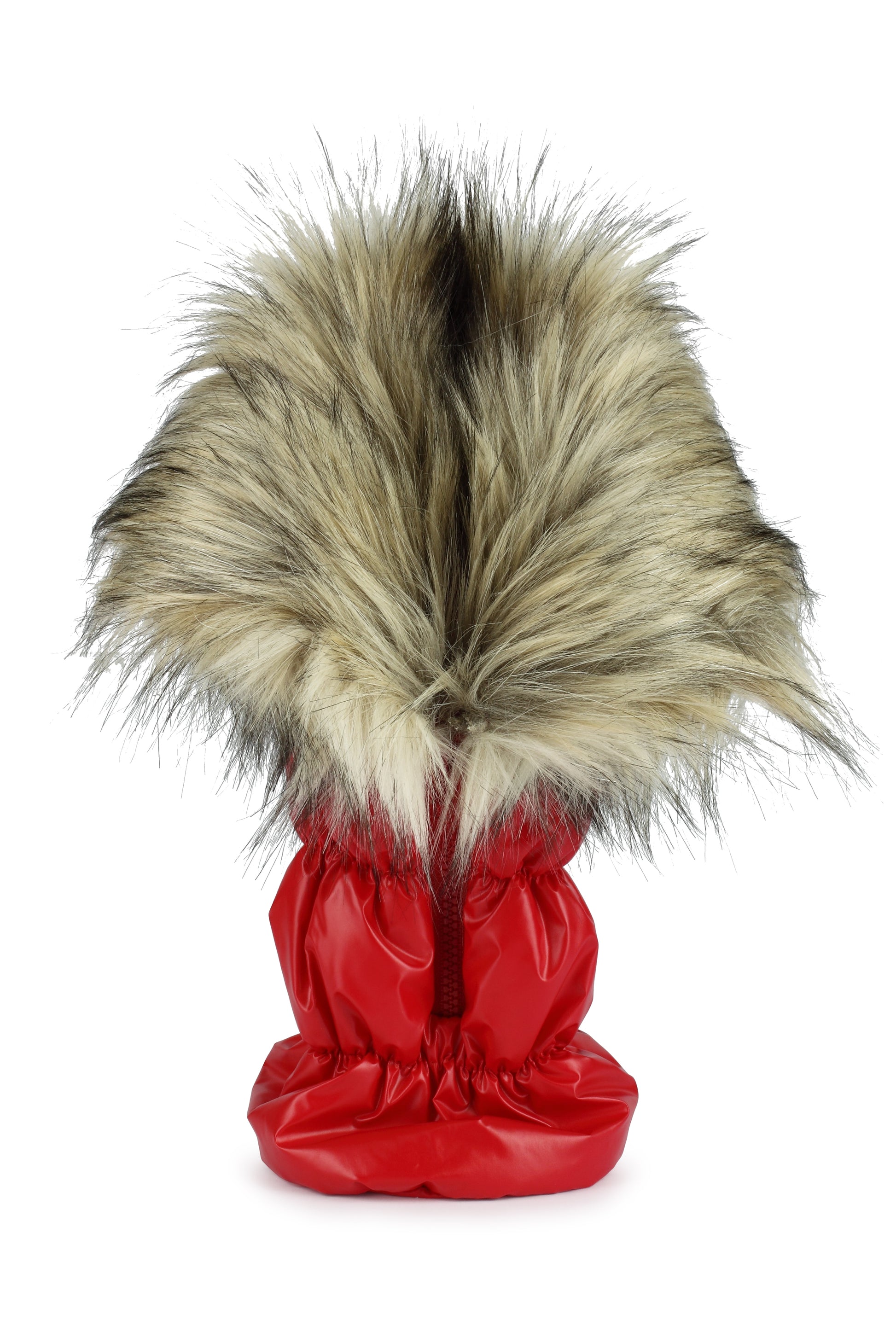 The Wine Parka Tote features a fur collar and zipper closure to complete its unique look.