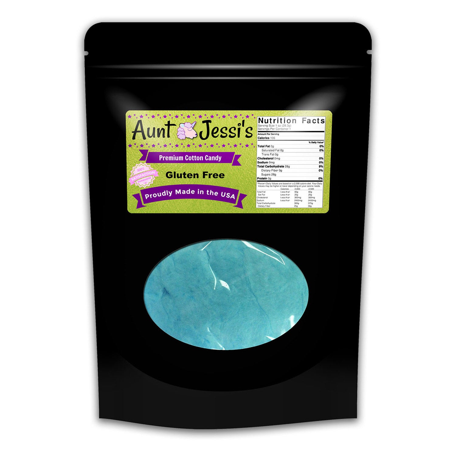 • Clear panel on back of bag gives a clear view of the tasty, blue fluffy candy guts inside